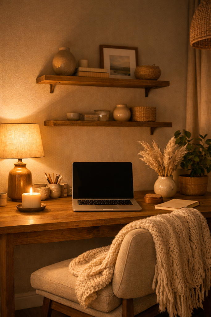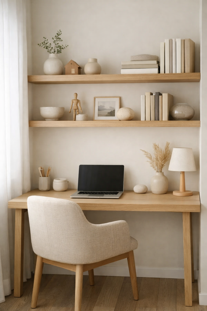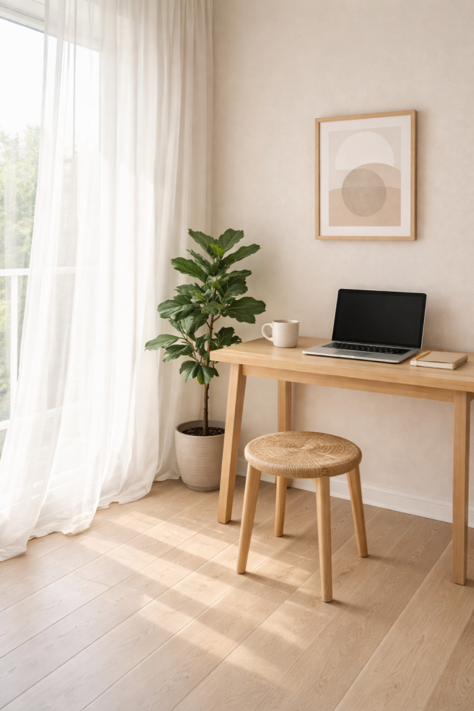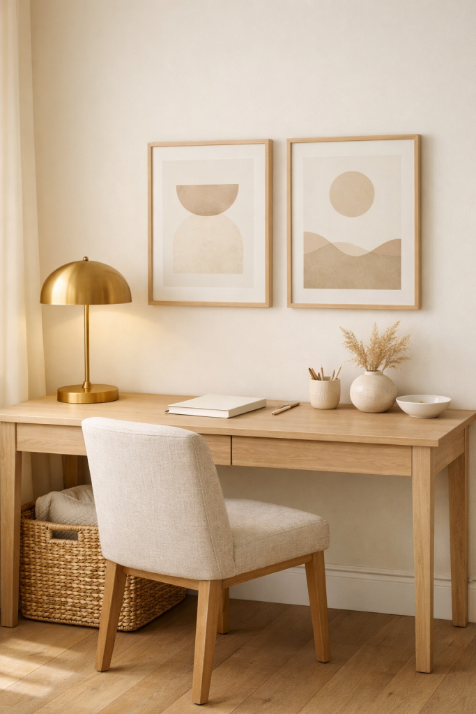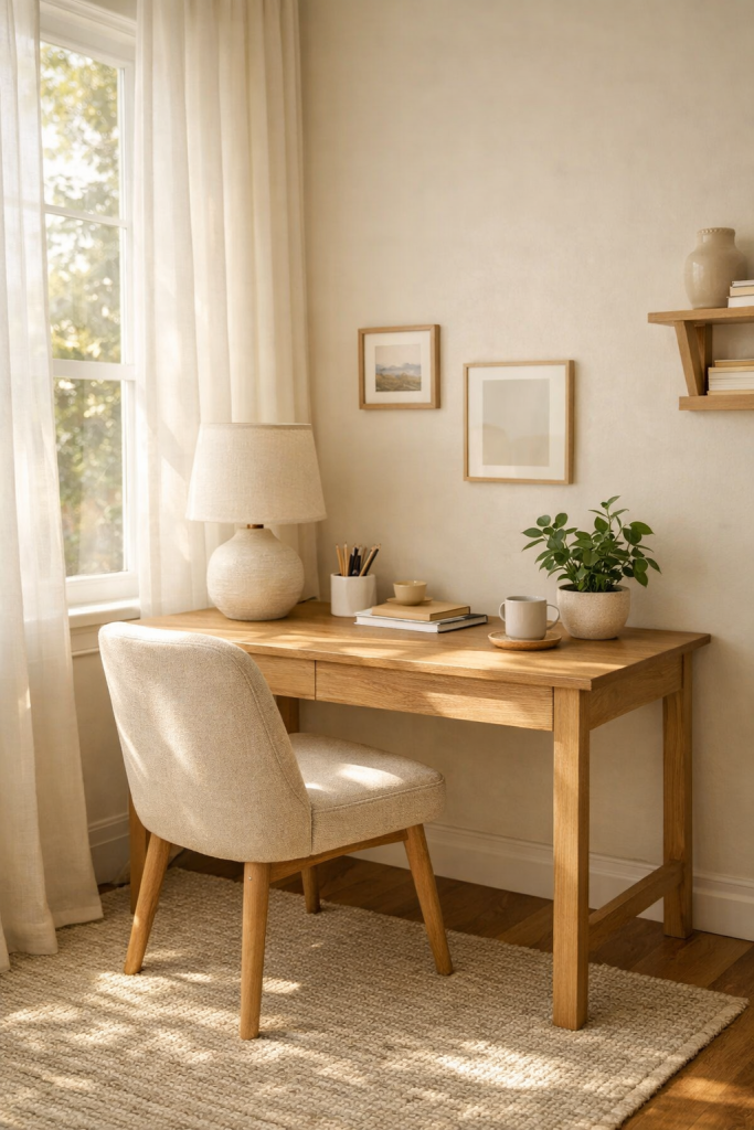 A simple wooden desk paired with a beige upholstered chair creates warmth without looking bulky. Add a light throw blanket for texture and comfort. Keep the decor minimal — maybe a ceramic lamp and a small plant.