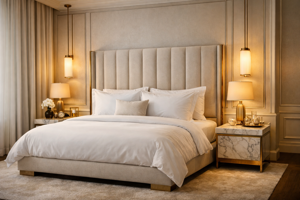 A luxury hotel-style bedroom is designed to give a premium and relaxing experience. The room features a large upholstered bed with a tall padded headboard, layered bedding with crisp white sheets, and soft pillows. Neutral tones like beige, cream, and gold accents create a rich and elegant look. Bedside tables with modern lamps and soft ambient lighting enhance the atmosphere. Floor-length curtains and a plush rug complete the luxurious feel, making the bedroom look like a 5-star hotel suite.