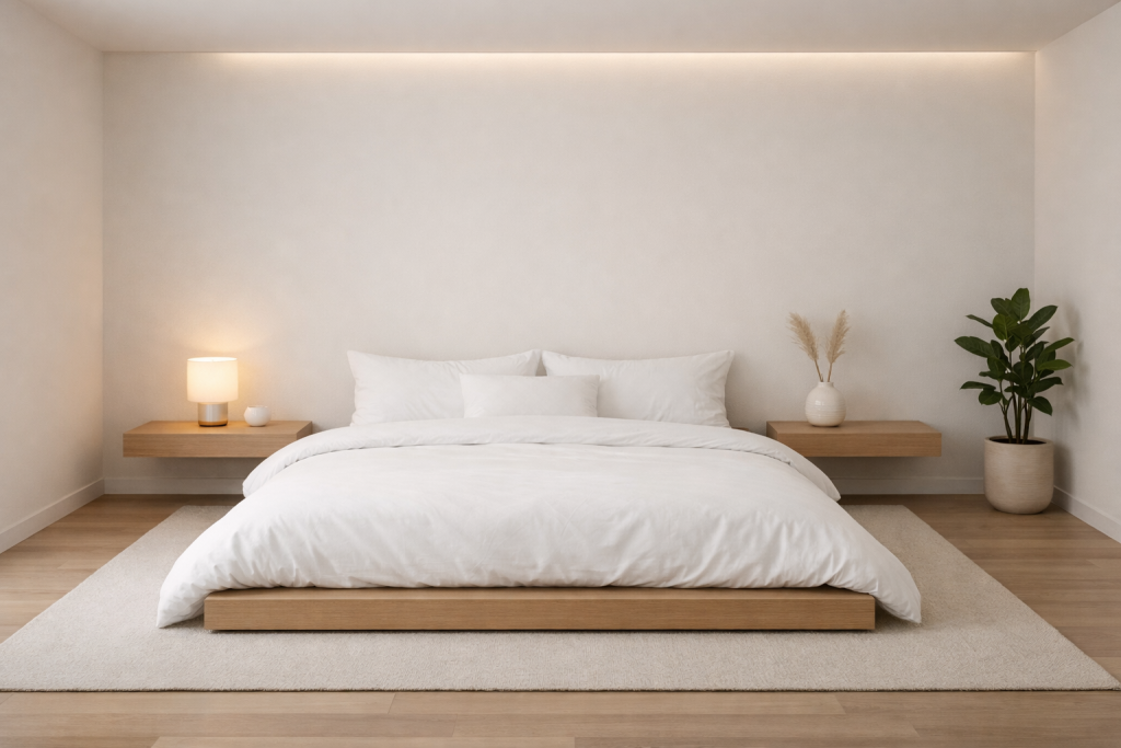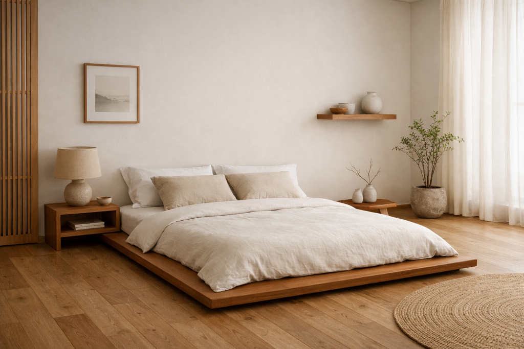 Japandi design combines Japanese minimalism with Scandinavian warmth. The bedroom features low furniture, natural materials, and neutral tones. The space is clean, simple, and peaceful, promoting relaxation and balance.