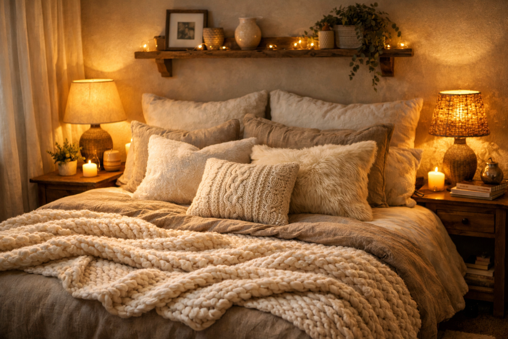 A cozy bedroom is all about comfort and warmth. Soft bedding, fluffy pillows, and knitted blankets create a relaxing environment. Warm lighting from bedside lamps and candles adds a soothing atmosphere. Neutral tones combined with soft textures make the space feel inviting and comfortable, perfect for unwinding after a long day.