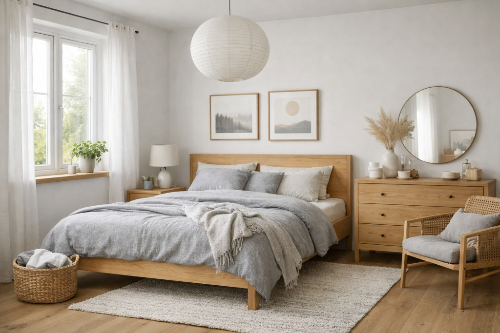 A Scandinavian bedroom features light colors, natural wood, and simple decor. The room is bright and airy with large windows allowing natural light to fill the space. Soft grey or white bedding, wooden furniture, and minimal decorations create a clean and cozy environment.