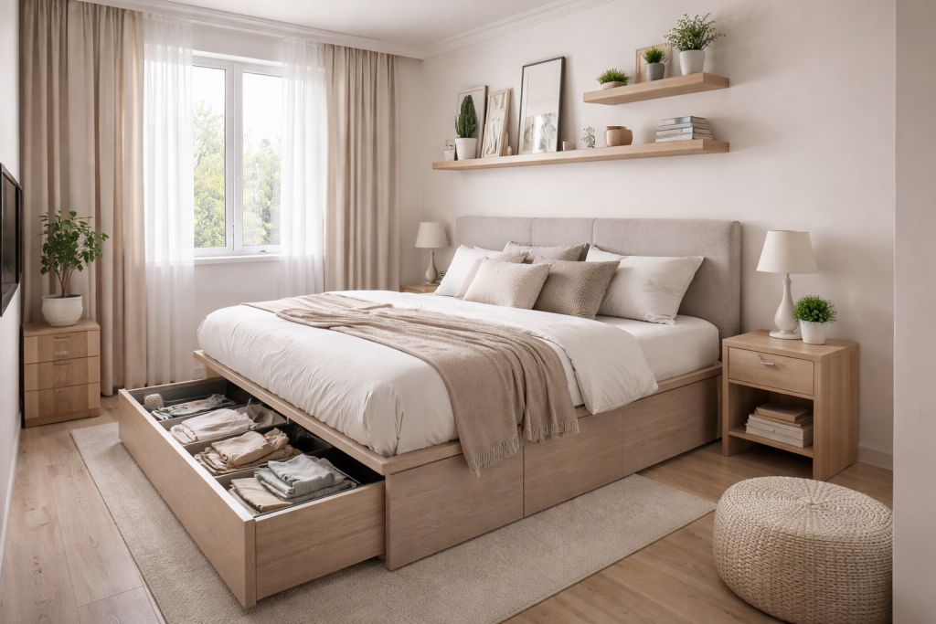 A small bedroom design focuses on maximizing space while maintaining style. Smart storage solutions like under-bed drawers, wall shelves, and compact furniture are used. Light colors and mirrors help make the room appear larger and brighter.