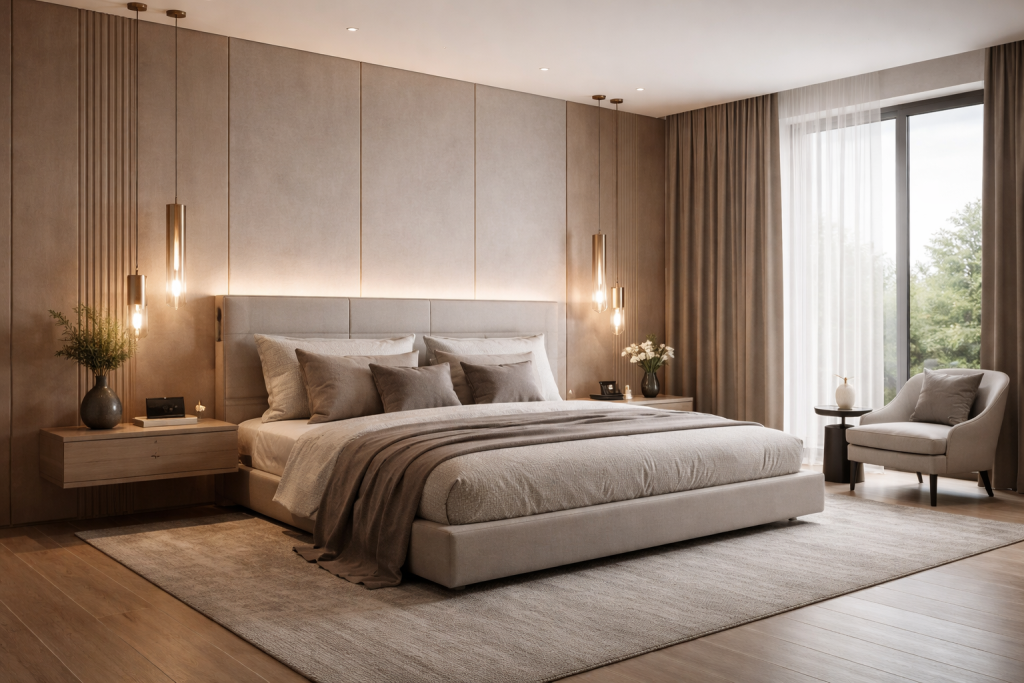 A contemporary bedroom includes modern furniture, stylish lighting, and clean finishes. Neutral colors with subtle accents create a fresh and elegant look. The design is simple yet sophisticated.