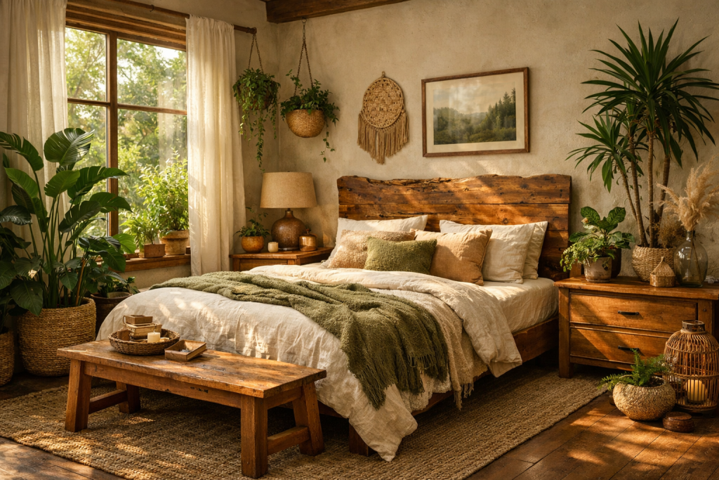 This bedroom brings nature indoors with wooden furniture, indoor plants, and earthy tones. Large windows allow sunlight to highlight natural textures, creating a calm and refreshing environment.